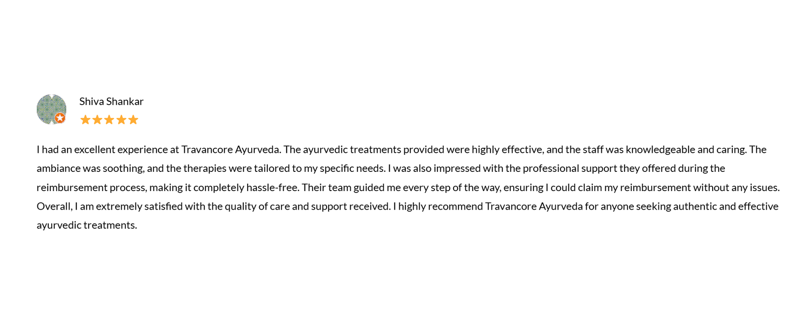 I had an excellent experience at Travancore Ayurveda. The ayurvedic treatments provided were highly effective, and the staff was knowledgeable and caring. The ambiance was soothing, and the therapies were tailored to my specific needs. I was also impressed with the professional support they offered during the reimbursement process, making it completely hassle-free. Their team guided me every step of the way, ensuring I could claim my reimbursement without any issues. Overall, I am extremely satisfied with the quality of care and support received. I highly recommend Travancore Ayurveda for anyone seeking authentic and effective ayurvedic treatments.